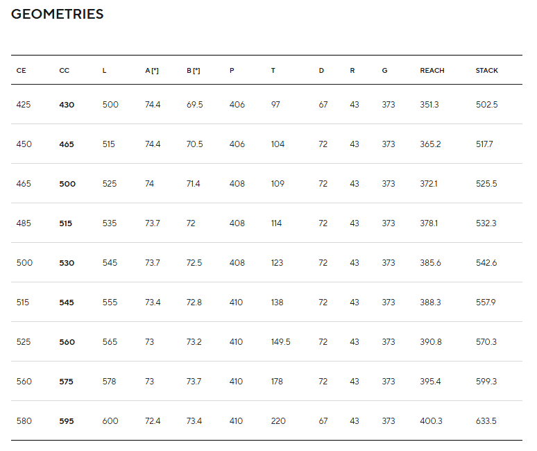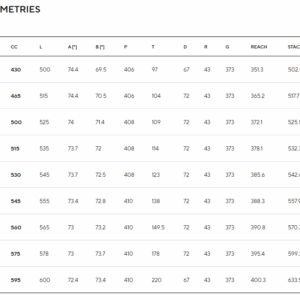 43cm, 46,5cm, 50cm, 51,5cm, 53cm, 54,5cm, 56cm, 57,5cm, 59,5cm