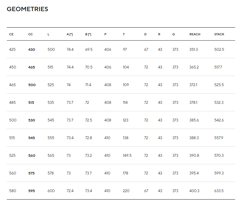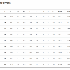 43cm, 46,5cm, 50cm, 51,5cm, 53cm, 54,5cm, 56cm, 57,5cm, 59,5cm